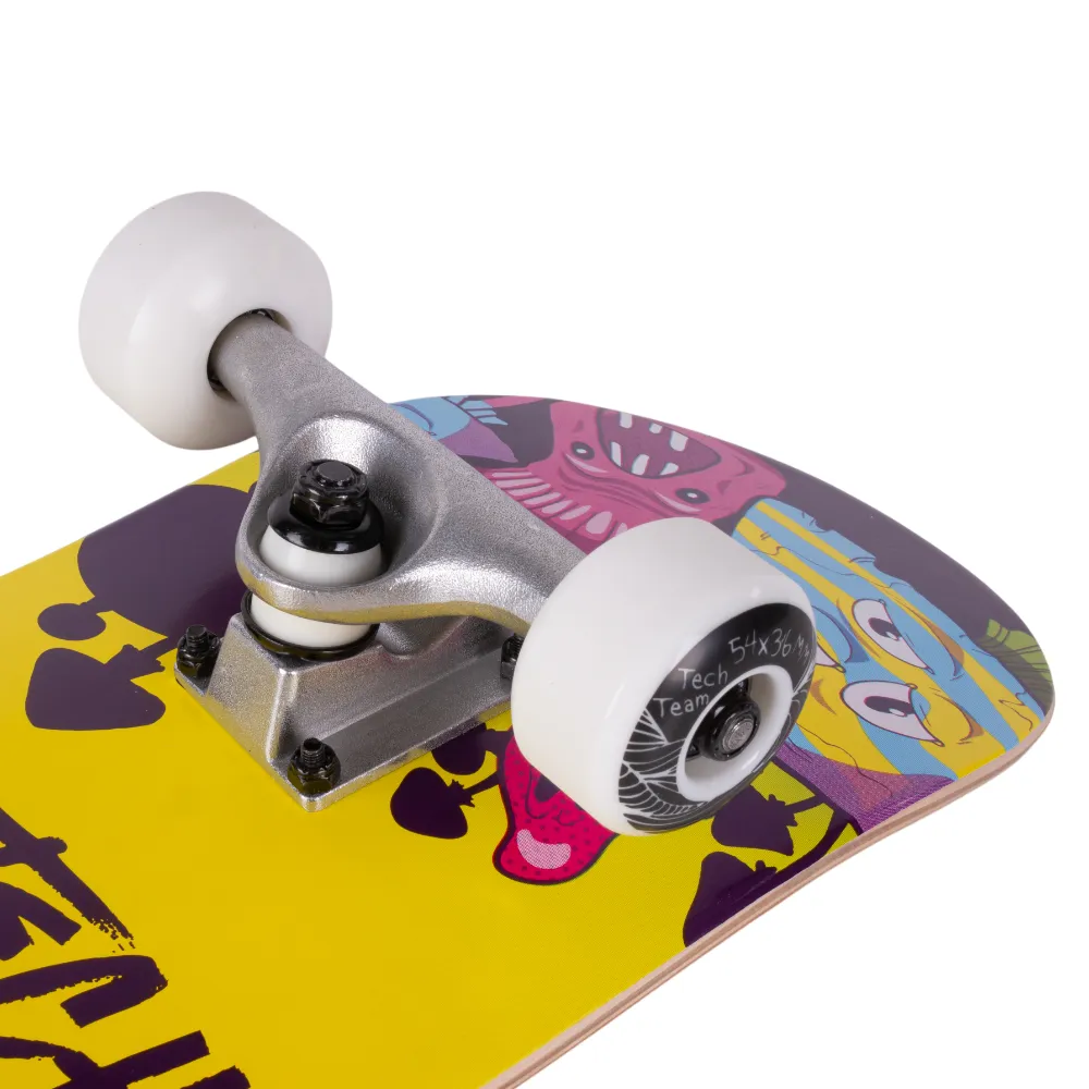 Добавьте яркости в свои ежедневные катания с помощью скейтборда Tech Team Aliens 2024 желтый. Этот продукт от компании Tech Team создан с учетом последних тенденций и технологий. Колеса из материала PU размером 54x36 мм и жесткостью 90А, в сочетании с подшипниками ABEC 9, обеспечивают плавность и стабильность движения. Дека из семи слоев русского клена размером 29.5”х7,5” и типом двойного концевого загиба (Double Kick) гарантирует уверенность в каждом движении. Черная шкурка с графикой на верхней части и яркий принт в желтых тонах с разноцветными монстрами на нижней части делают этот скейтборд неповторимым. С Tech Team Aliens 2024 желтый каждая поездка станет незабываемой!