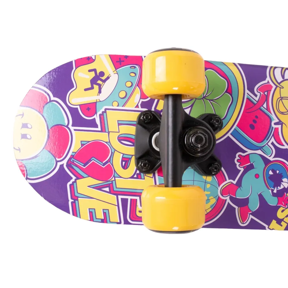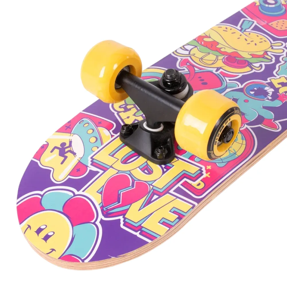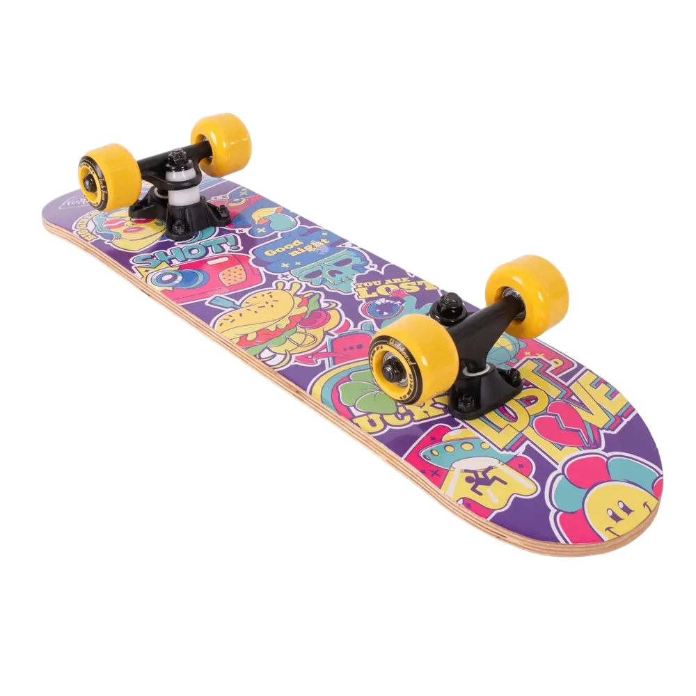 Скейтборд Tech Team Profi 2024 желтый - это смелый выбор для тех, кто ценит качество и стиль. С этим скейтбордом вы заметите, как город оживает под колесами из полиуретана размером 50x36 мм, обеспечивающих оптимальную жесткость 85А. Дека из 9 слоев прочного китайского клена гарантируют устойчивость и долговечность, а ее размеры 24”х6” обеспечивают максимальный комфорт при катании. Верхняя часть покрыта чёрной шкуркой 80AB для непревзойденного сцепления, а нижняя часть украшена эксклюзивным принтом в жёлтых тонах, вдохновленным винтажными наклейками. Скейтборд оснащен подшипниками ABEC 5 для плавного и быстрого движения, а двойной концевой загиб Деки (Double Kick) позволяет выполнять трюки с легкостью. Это не просто скейтборд, это способ выразить себя.