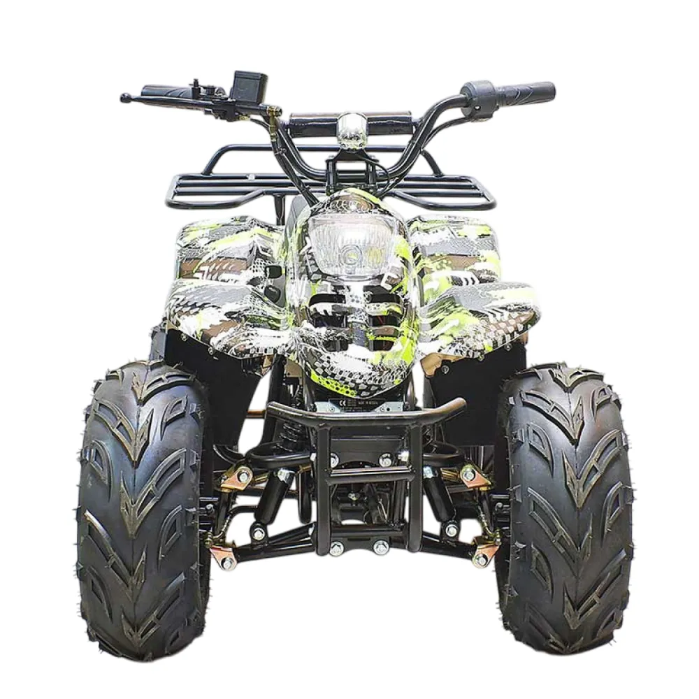 При мощности двигателя 800 Вт способен развивать скорость до 30 км/час. Объемные легко сцепляемые с поверхностью колеса по внешнему виду напоминают вездеходные. Квадроцикл предназначен для езды по городской местности и парковой зоне. оснащен комфортными мягкими сиденьями, прост в управлении и обслуживании.