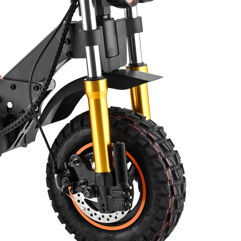 11″ переднее и 10″ заднее колесо + амортизаторы делают поездку мягкой и устойчивой.