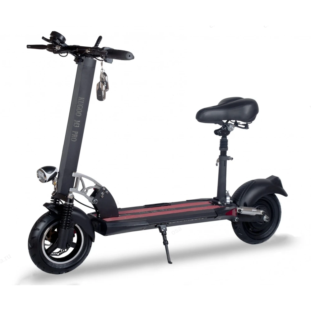 Преимущества Kugoo M3 PRO видны не вооруженным взглядом. Он очень удобный, в комплекте идет сидение, которое можно установить при желании. Его можно отрегулировать по высоте. Широкая платформа, две ноги можно поставить рядом, внутри установлен аккумулятор литий-ионный, емкость 11 А*ч, дальность хода на одном заряде 35 км.