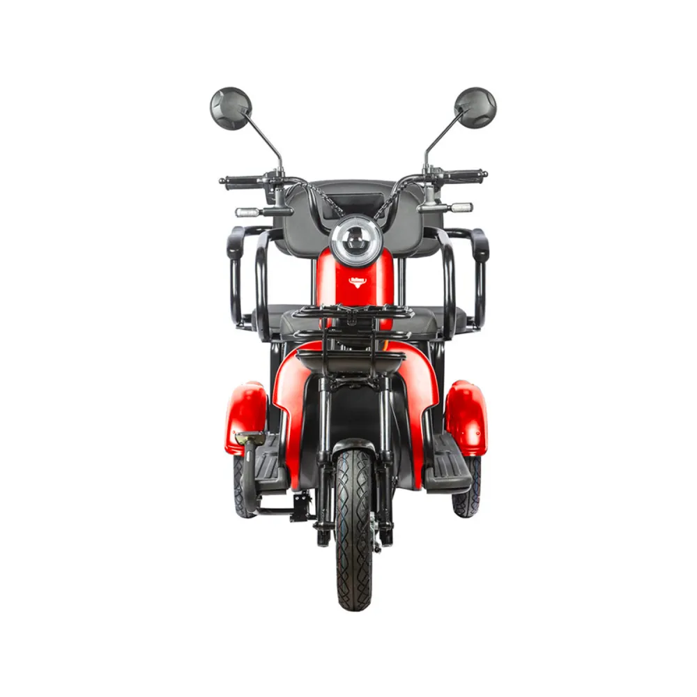 Трицикл Rutrike Караван красный – яркая и заметная техника популярная средств отечественных пользователей и жителей СНГ. Трицикл с грузоподъемностью 150 кг рассчитан на 3 человек, 2 из которых пассажира. Изготовлен с учетом пожеланий пользователей и предпринимателей. Отличается от других вариантов отличными показателями комфорта. Широкое вместительное сиденье для пассажиров оснащено спинкой и подлокотниками, удобное для ознакомления с достопримечательностями и отдыха в парковой зоне.