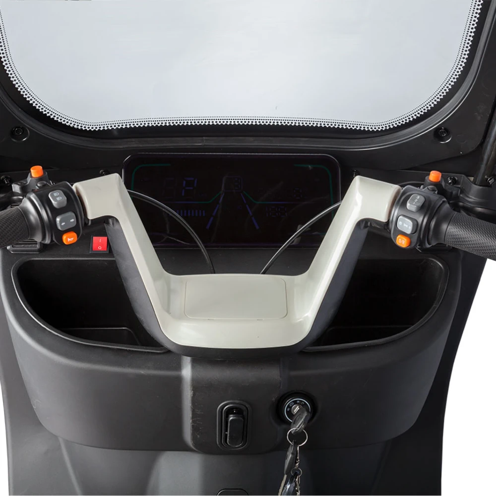 2. Модель Rutrike Gelbert Sarin — трехколесный электротрицикл с мощным двигателем 1000 Вт и возможностью выбора аккумулятора с напряжением 48 или 60 В. Это устойчивый и надежный транспорт, предназначенный для комфортного передвижения по городу и пригородам. Модель оснащена крышей и зеркалами заднего вида, что повышает безопасность и комфорт при эксплуатации.
