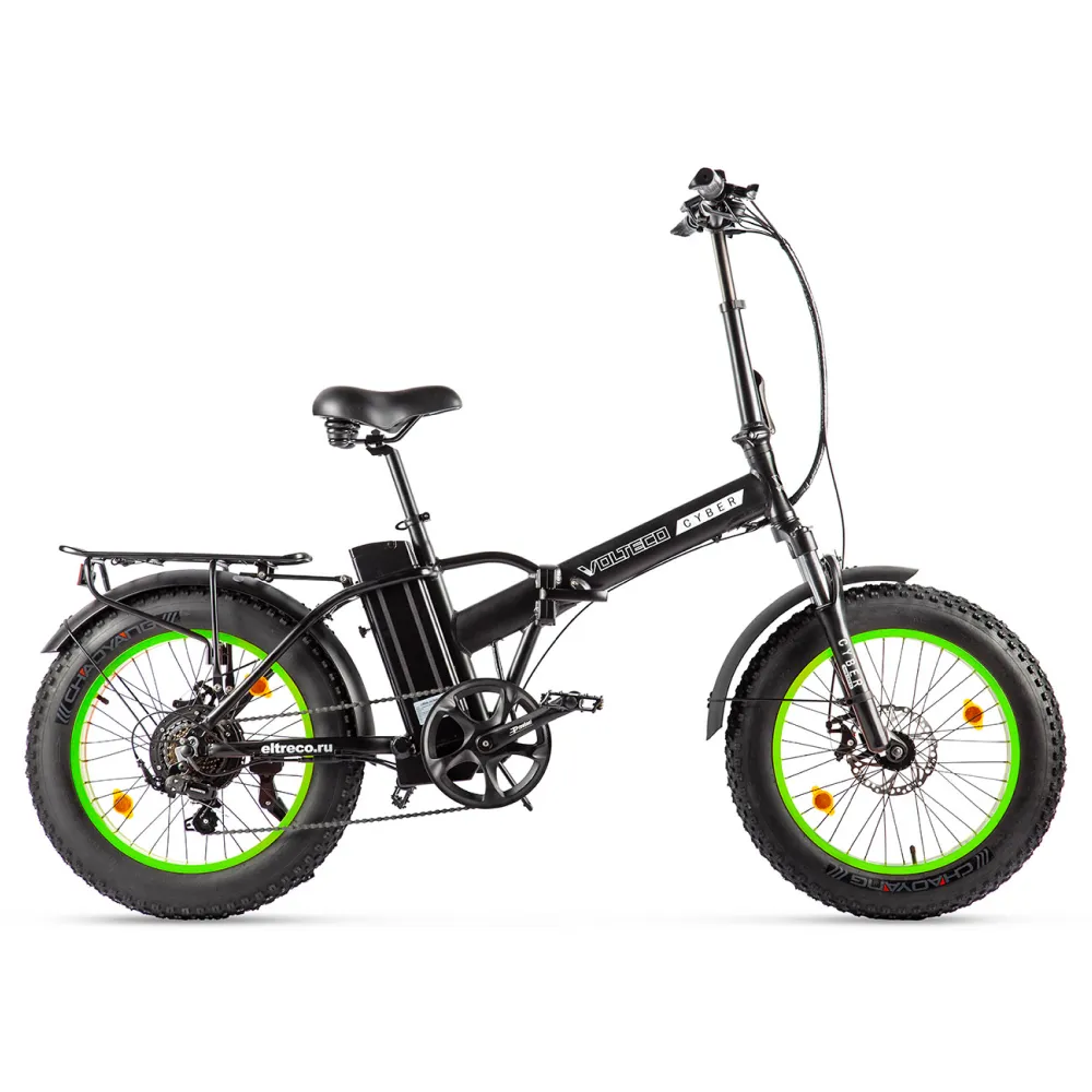 Бренд VOLTECO модели CYBER стильного, аппетитного черно-салатового цвета относится к топу  наиболее популярных производителей электротехники. История появления электрофэтбайка говорит о том, что у него было конкретное предназначение, для использования в сельской и лесной местности как вездеходную технику. Проходимость практически в любых сложных условиях не приносит при этом никакого дискомфорта, без использования мускульной тяги. Имеет 7 скоростей, способность которых подстроиться под любые трудности несовершенного покрытия дороги. Что особо актуально в лесном и горном массиве. Нужно помнить и соблюдать правила и рекомендации по эксплуатации для долговечной работы. Выезжать на заряженном аккумуляторе не менее 100%.  И тогда пользование принесет большое удовольствие и огромный срок службы не только вам, но и в наследство вашим детям. Управление совсем не сложное, как у обычного, только за счет электродвигателя высокая проходимость и практически бесконечное пользование. Пробег на одном заряде не менее 50 километров с максимальной нагрузкой не более 120 килограмм