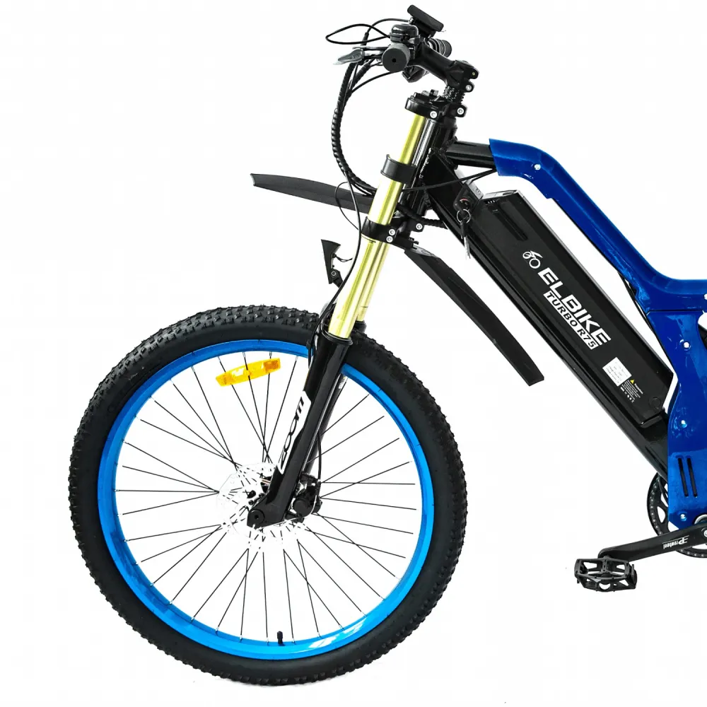 Электровелосипед Elbike TURBO R65 премиум класса представлен в благородном синем цвете. Мощный мотор 500 Вт, большой размер колёс в 26 дюймов, электровелосипед разгоняется до 40 км/ч.