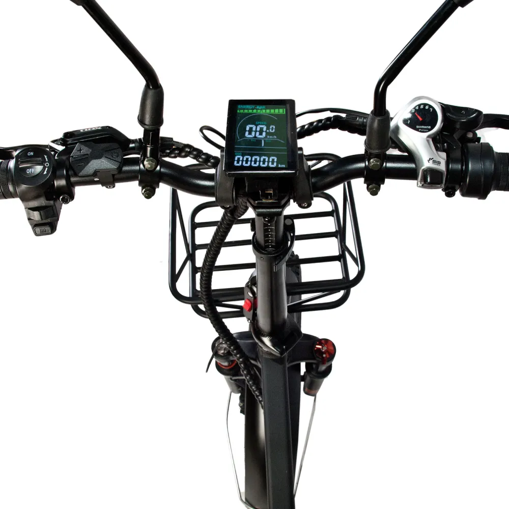 Максимальный функционал позволяет контролировать скоростные характеристики, заряд АКБ и пробег. Наличие зеркал заднего вида, передней вместительной корзины и заднего багажника делает эксплуатацию практичной. Техника позволяет безопасно передвигаться среди других участников движения, использовать электровелосипед ежедневно, для поездок на работу или за продуктами, перевозить детей на недалекие расстояния.