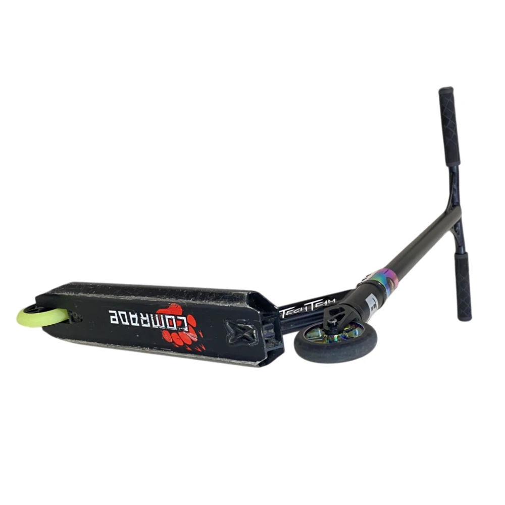 Трюковой самокат Tech Team Comrade - это идеальный выбор для начинающих и опытных райдеров, стремящихся к новым достижениям в мире трюков и катания. С высотой руля от деки в 590 мм, он обеспечивает удобную посадку для наездников ростом от 120 до 165 см. Конструкция самоката выполнена из прочного алюминия ALU 6061, что гарантирует надежность и долговечность. Самокат оснащен высококлассными подшипниками ABEC 7 Carbon, которые обеспечивают плавный и быстрый катание. Его вес всего 3,35 кг делает его легким и маневренным, а максимальная нагрузка до 100 кг позволяет использовать его как подросткам, так и взрослым. С диаметром колес 110 мм и материалом из полиуретана, самокат обеспечивает отличное сцепление и комфорт при катании. Задний ножной тормоз обеспечивает надежное торможение, в то время как система компрессии HIC позволяет легко выполнять трюки. Размер деки составляет 510 мм в длину и 115 мм в ширину, что обеспечивает достаточное пространство для ног. Ширина руля в 540 мм добавляет стабильности во время выполнения трюков. Обратите внимание, что самокат не складной, что делает его более прочным и надежным для активного катания. Tech Team Comrade — это самокат, который вдохновит вас на новые свершения! Самокат использовался в тест-драйве, поэтому имеет царапины на корпусе, которые не влияют на его техническое состояние. Это идеальный выбор для тех, кто хочет попробовать свои силы в трюковом катании без больших затрат.